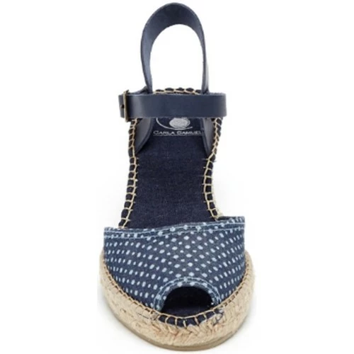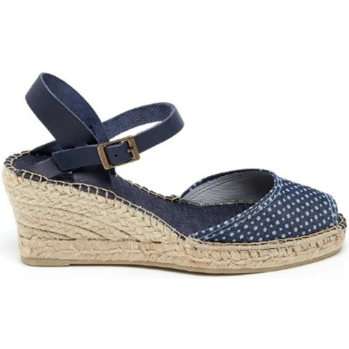Espadrille compensée avec des petits pois blancs, fermée par une bride fine au niveau de la cheville.