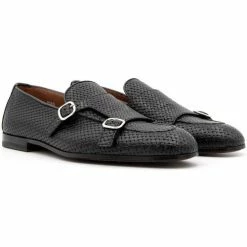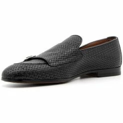 Mocassins à double boucle en cuir de veau noir, avec boucles argentées. Coutures de bol fabriquées à la main. Fabrication Blake avec semelle en cuir avec semelle demi-caoutchouc