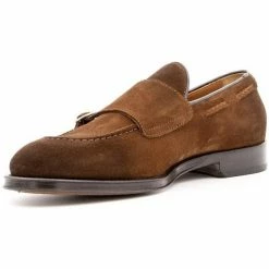 Modèle mocassin avec rabat sur la tige avec 2 boucles réglables. Plateau cousu et filetage latéral en cuir tressé. Couleur: snuf. Cuir: pointe.