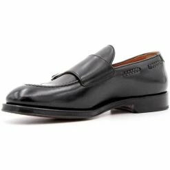 Modèle mocassin avec rabat sur la tige avec 2 boucles réglables. Plateau cousu et filetage latéral en cuir tressé. Couleur noire. Cuir: cheval.