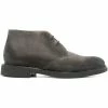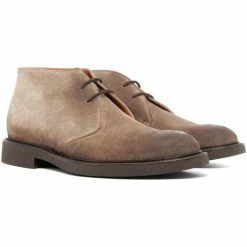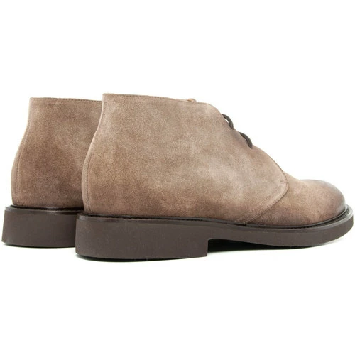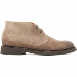 Modèle haut en cheville lacée. Dessus lisse et semelle gomme. Couleur : café. Cuir suédé graissé. Fabriqué en Italie