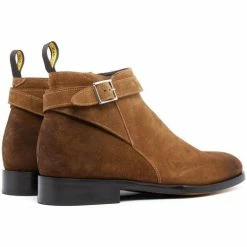 Bottine en daim dans les tons tabac, avec bride cheville à boucle. Fermeture éclair interne. Traitement Blake