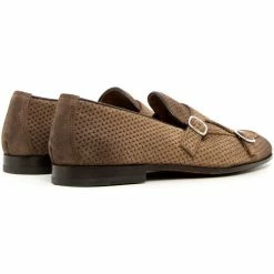 Mocassin à double boucle en cuir imprimé bokeh noyer, avec boucles réglables. Coutures au bol faites à la main. Fabrication Blake avec semelle cuir.