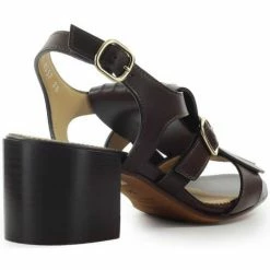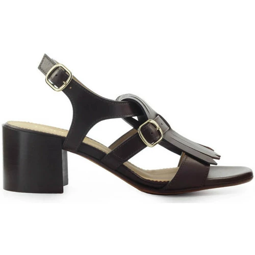Sandale Doucal’s en cuir marron foncé, agrémentée d’une frange sur le devant et d’une bride avec boucle en métal doré. Bout arrondi et fermeture à la cheville. Semelle en cuir à talon large, hauteur 6 cm